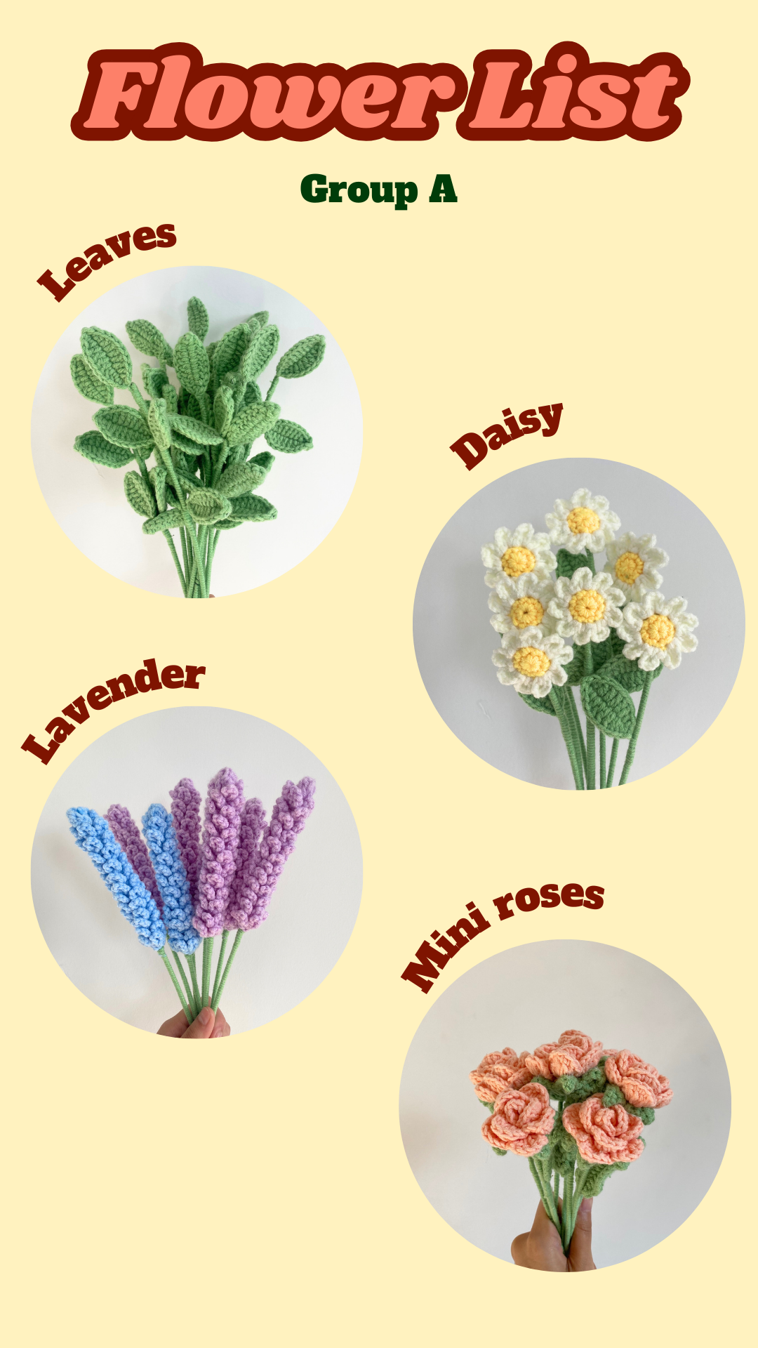 One animal flower, two scorpion grasses, two flower group A. Please refer to the photo of flower list and comment your two choice of flowers Group A.